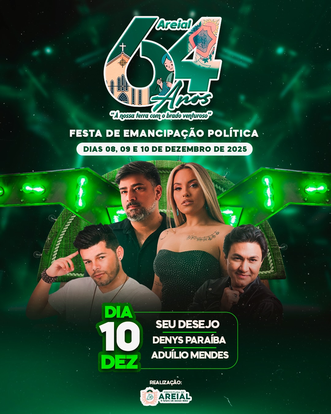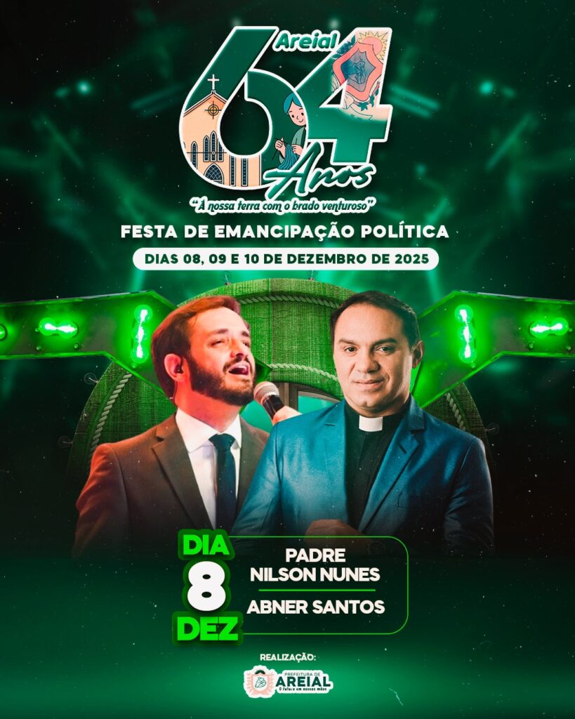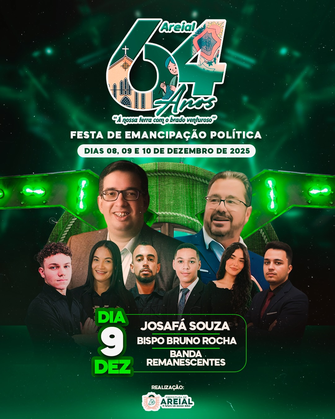 O município de Areial está comemorando seus 64 anos de emancipação política, e a Prefeitura, sob a gestão do prefeito Carlos Henrique e do vice Diego, preparou uma ampla programação com inaugurações de obras e apresentações musicais. As atividades iniciaram no dia 6 e seguem até o dia 10 de dezembro, reunindo momentos religiosos, atrações culturais e artistas conhecidos do público.
