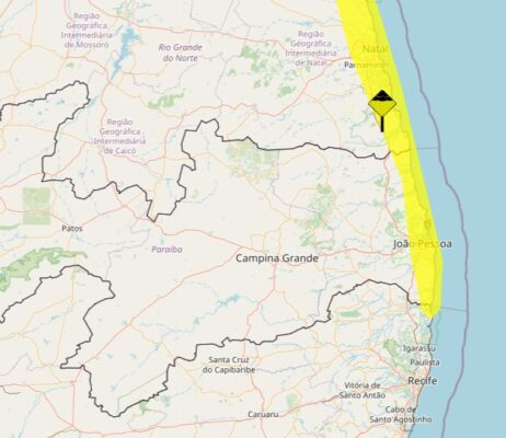 Entre as cidades sob alerta estão Alhandra, Baía da Traição, Bayeux, Caaporã, Cabedelo, Conde, João Pessoa, Lucena, Marcação, Mataraca, Pitimbu, Rio Tinto e Santa Rita. O aviso é válido para a Mata Paraibana, o Leste Potiguar e a Mata Pernambucana.