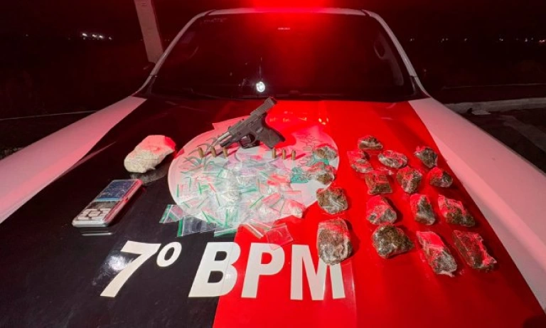 No bairro de Marcos Moura, os policiais avistaram um homem suspeito e na abordagem foram encontrados um revólver, calibre 38, com munições intactas, 5 pinos de cocaína, 5 pacotes de maconha, 2 câmeras de monitoramento e dinheiro em espécie. O suspeito foi preso em flagrante e encaminhado para a delegacia.
