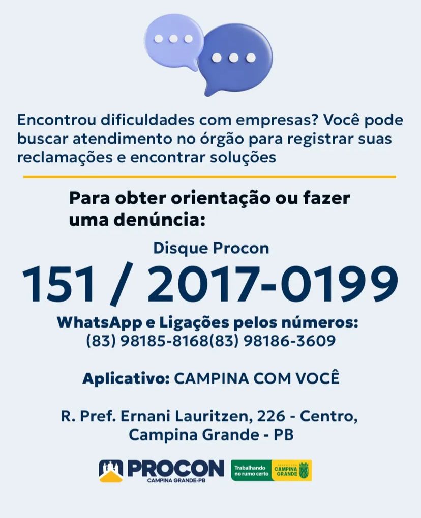 Os consumidores que enfrentarem problemas podem registrar suas reclamações por meio dos canais de atendimento disponíveis na bio e no feed das redes sociais oficiais do Procon Campina Grande.